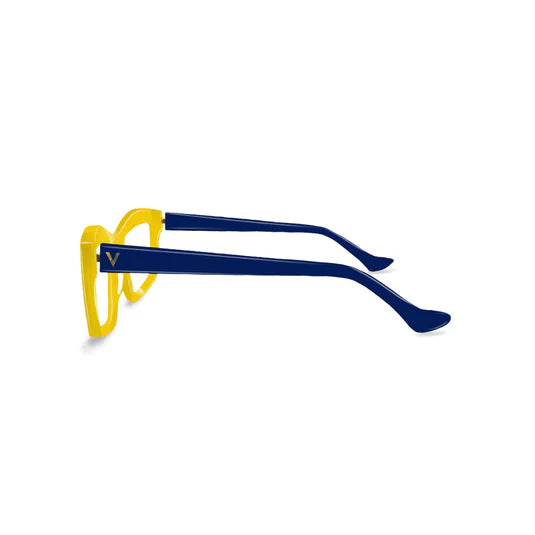 Mpenzi frames embody a spirit of unconfined passion, as reflected in their name, which means "beloved" in Swahili. These uniquely patterned rectangular frames showcase a vibrant combination of yellow, blue, and a touch of white, creating a striking and eye-catching design.
