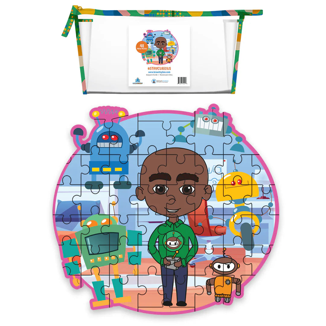 Can you complete the giant puzzle of Justin and his little robot friend Buddy? This circular shaped puzzles with fun shapes features Justin and Buddy in their brightly colored lab surrounded by robot inventions.