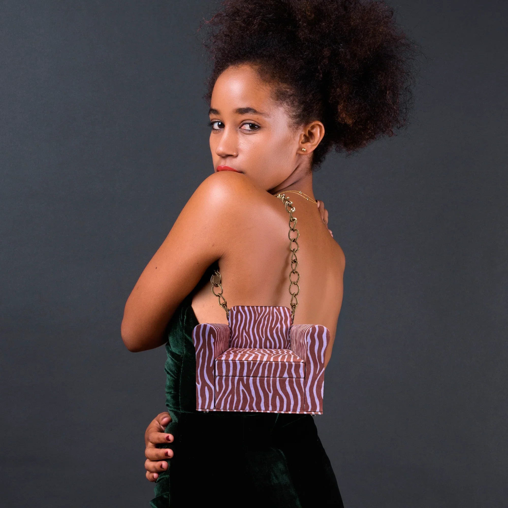 Meet COZY, the sofa chair purse that turns comfort into couture. Crafted in luxe pony hair with gold hardware and chain strap, this bag looks like it just stepped out of a living room.