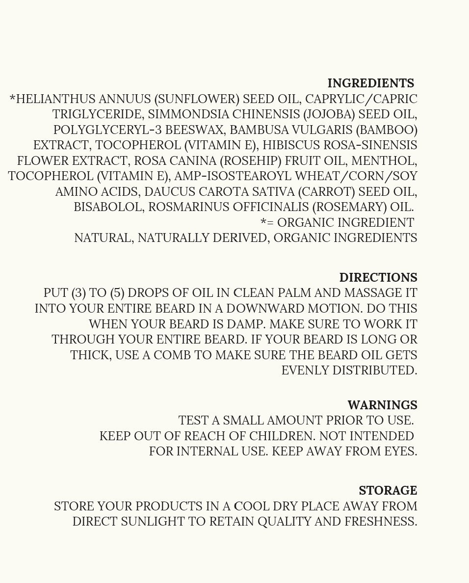 Put (3) to (5) drops of oil in clean palm and massage it into your entire beard in a downward motion. Do this when your beard is damp. Make sure to work it through your entire beard. If your beard is long or thick, use a comb to make sure the beard oil gets evenly distributed.