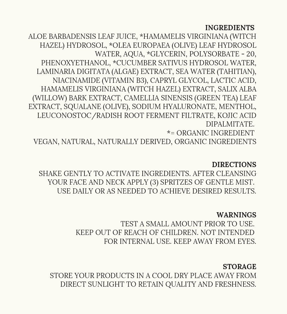 Aloe Barbadensis Leaf Juice, *Hamamelis Virginiana (Witch Hazel) Hydrosol, *Olea Europaea (Olive) Leaf Hydrosol Water, Aqua, *Glycerin, Polysorbate – 20, Phenoxyethanol, *Cucumber Sativus Hydrosol Water, Laminaria Digitata (Algae) Extract, Sea Water (Tahitian), Niacinamide (Vitamin B3), Capryl Glycol, Lactic Acid, Hamamelis Virginiana (Witch Hazel) Extract, Salix Alba (Willow) Bark Extract, Camellia Sinensis (Green Tea) Leaf Extract, Squalane (Olive), Sodium Hyaluronate, Menthol, Leuconostoc/Radish Root Ferment Filtrate, Kojic Acid Dipalmitate.
