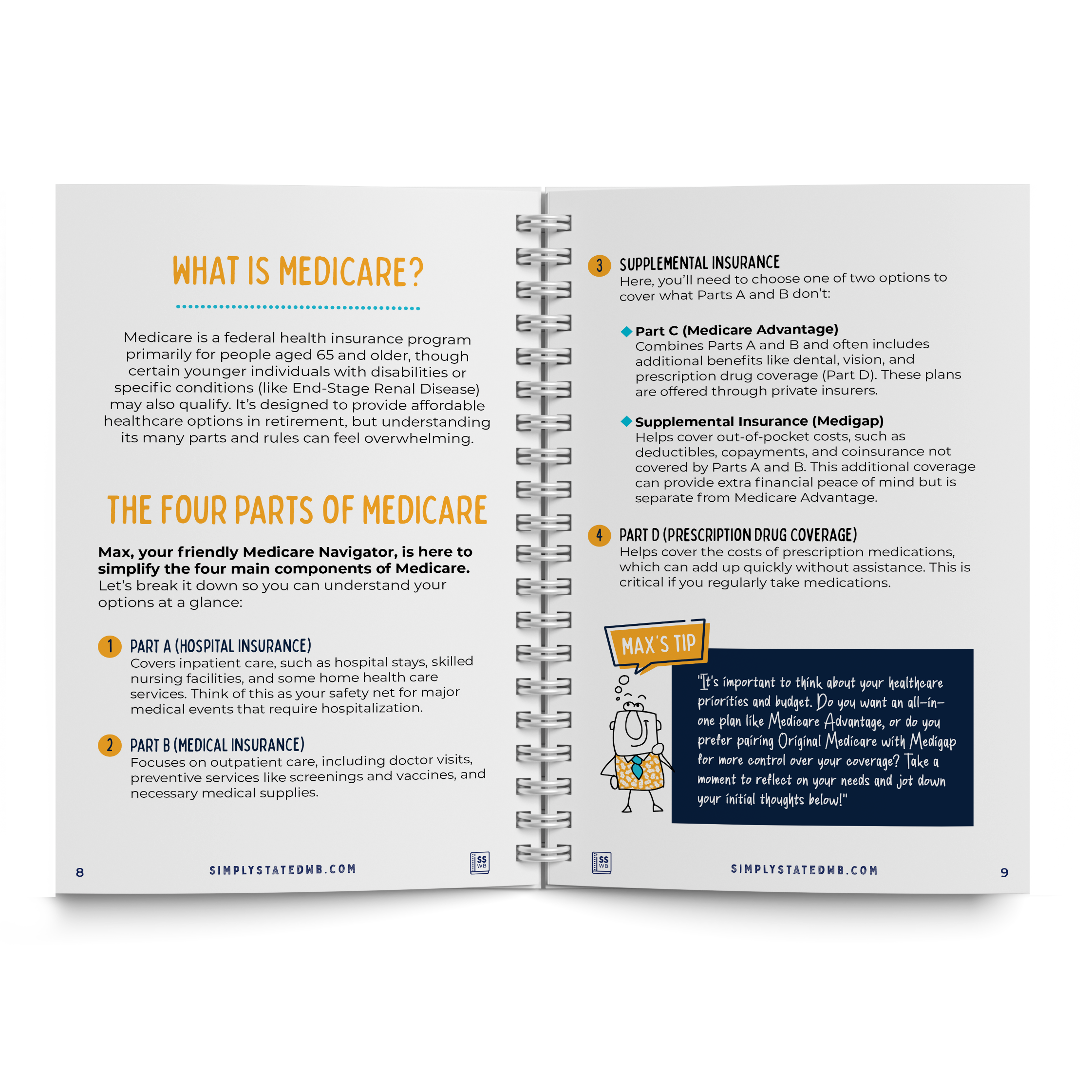 Interactive workbook with checklists, prompts, and guidance to simplify Medicare decisions, featuring Max, your friendly companion for navigating healthcare with confidence.